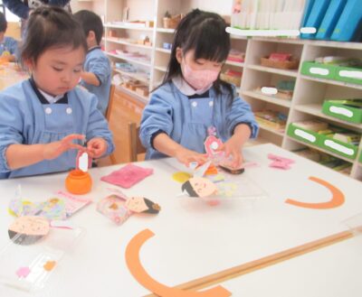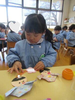 仕上げは、のりを使っておひなさまとおだいりさまの帽子と持ち物などを貼りました!
