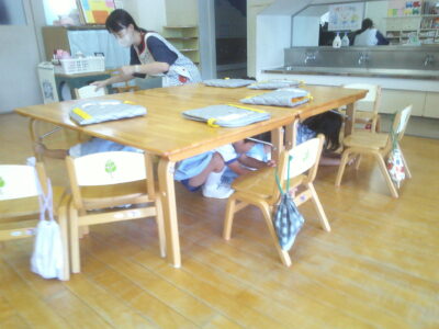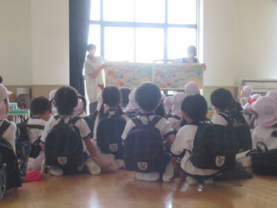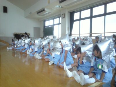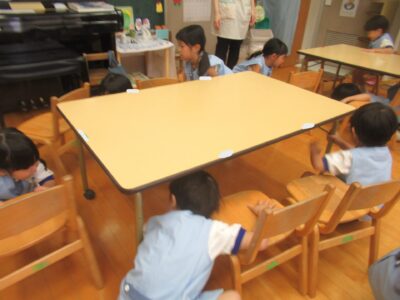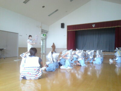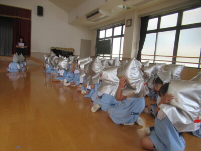 訓練は何度も行っていますが、避難の仕方や、「おかしなも」のお約束、防災頭巾の被り方などをもう一度確認しました。