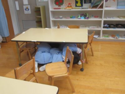 地震が来たら、まずは体を丸めて机の下に入って身を守るということを覚えていて、頭や足もしっかりと隠すことができていました。